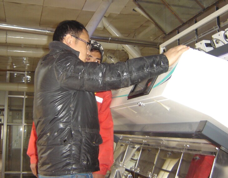 圖為技術(shù)人員正在調(diào)試色選機 尚保福(攝)