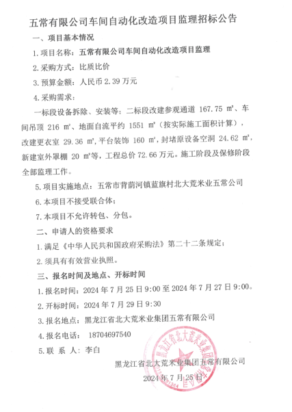 五常有限公司車間自動(dòng)化改造項(xiàng)目監(jiān)理招標(biāo)公告