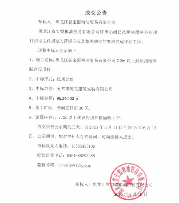 黑龍江省寶盟糧油貿易有限公司7.2m以上封頂擋糧隔斷建設項目成交公告