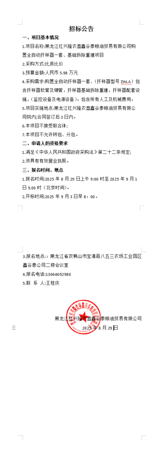 黑龍江紅興隆農(nóng)墾鑫谷泰糧油貿(mào)易有限公司購置全自動扦樣器一套、基礎拆除重建項目