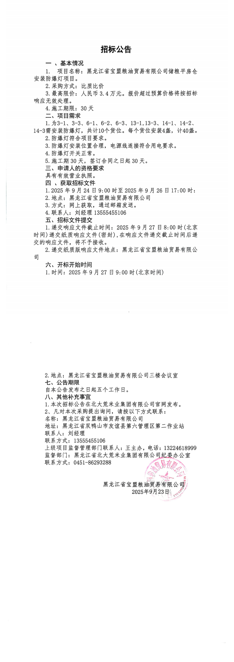 黑龍江省寶盟糧油貿(mào)易有限公司儲糧平房倉安裝防爆燈項(xiàng)目招標(biāo)公告