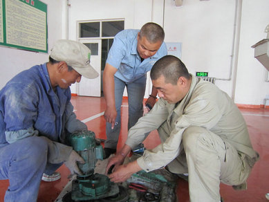 圖為北大荒米業(yè)優(yōu)秀共產(chǎn)黨員方德坤(中)指導(dǎo)工人維修烘干機(jī)械