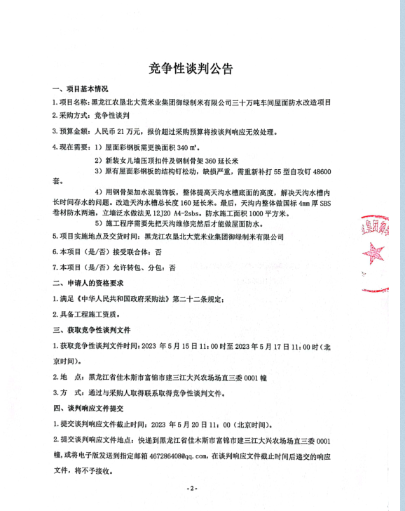 黑龍江農(nóng)墾北大荒米業(yè)集團(tuán)御綠制米有限公司三十萬(wàn)噸車間屋面防水改造項(xiàng)目招標(biāo)公告