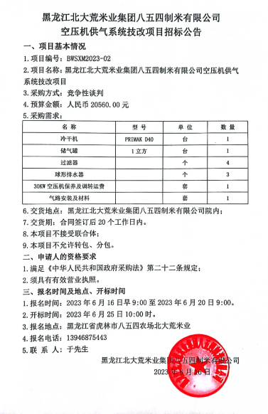 北大荒米業(yè)八五四公司空壓機(jī)供氣系統(tǒng)技改項(xiàng)目招標(biāo)公告
