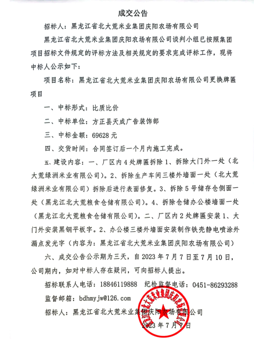黑龍江省北大荒米業(yè)集團(tuán)慶陽(yáng)農(nóng)場(chǎng)有限公司更換牌匾項(xiàng)目成交公告