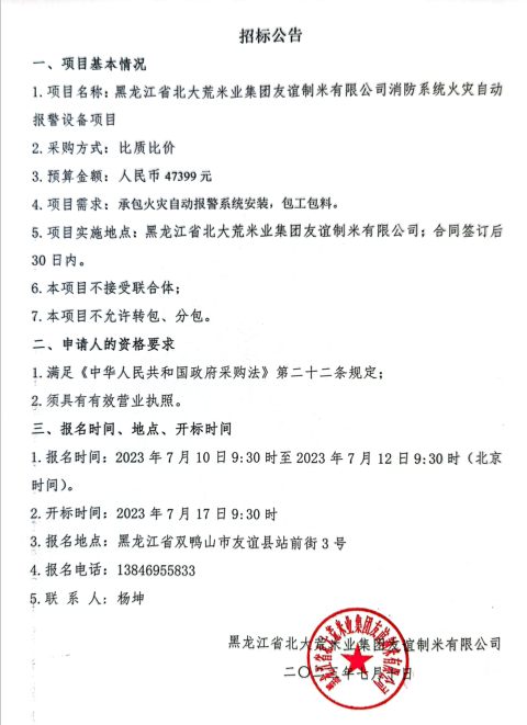 黑龍江省北大荒米業(yè)集團友誼制米有限公司消防系統(tǒng)火災(zāi)自動報警設(shè)備招標公告