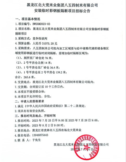 黑龍江省北大荒米業(yè)集團(tuán)八五四制米廠有限公司安裝臨時(shí)彩鋼板隔斷項(xiàng)目招標(biāo)公告