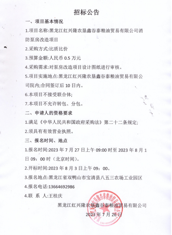 黑龍江紅興隆農(nóng)墾鑫谷泰糧油貿(mào)易有限公司消防泵房改造項(xiàng)目招標(biāo)公告