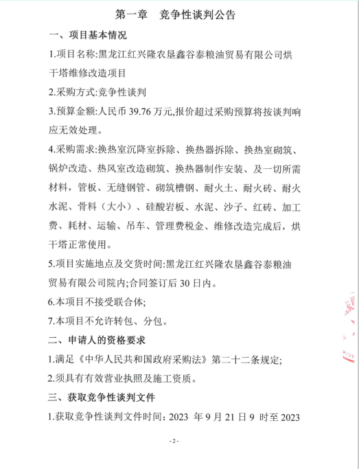 黑龍江紅興隆農(nóng)墾鑫谷泰糧油貿(mào)易有限公司烘干塔維修改造項(xiàng)目競爭性談判公告