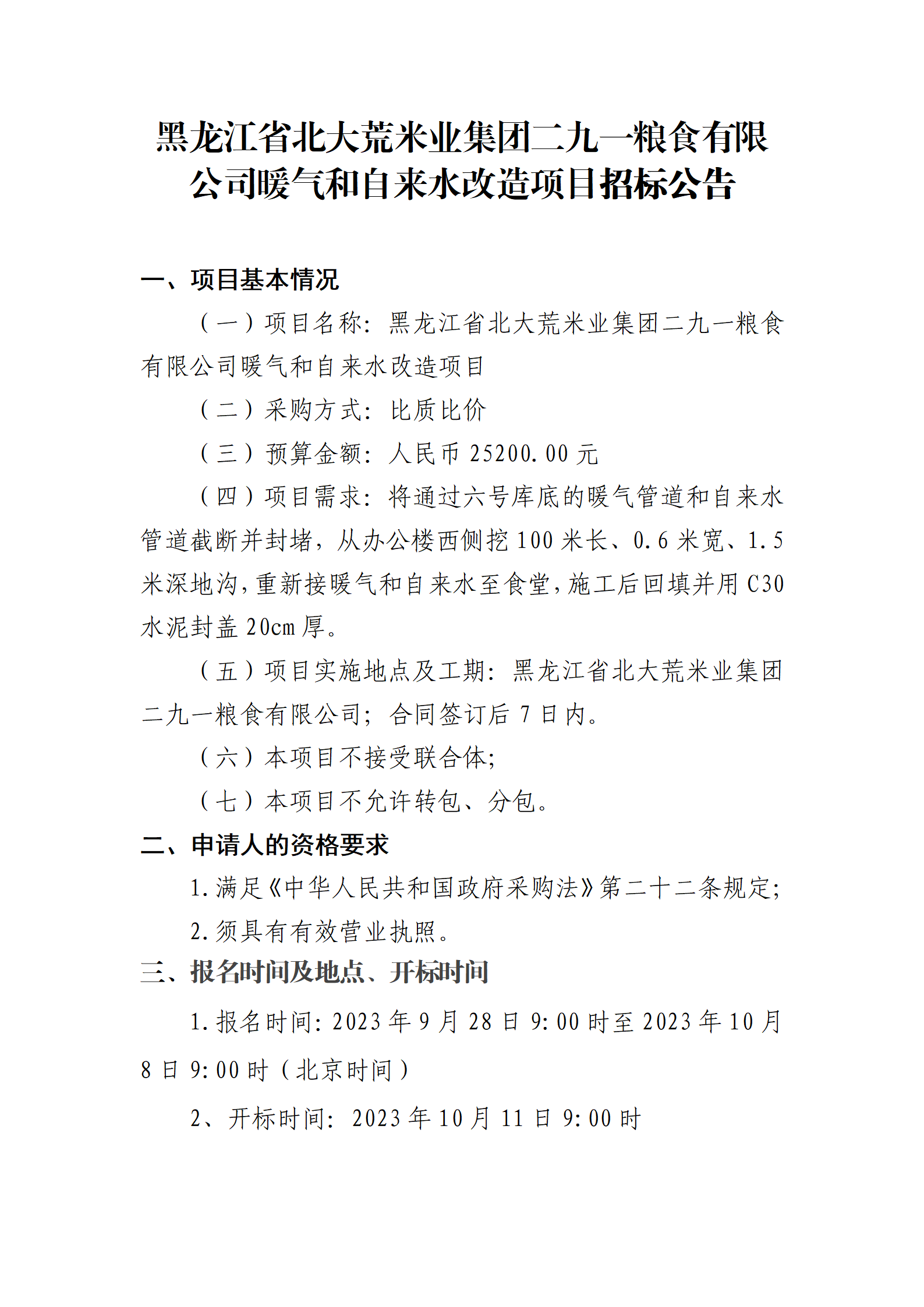 黑龍江省北大荒米業(yè)集團(tuán)二九一糧食有限公司暖氣和自來水改造項目招標(biāo)公告
