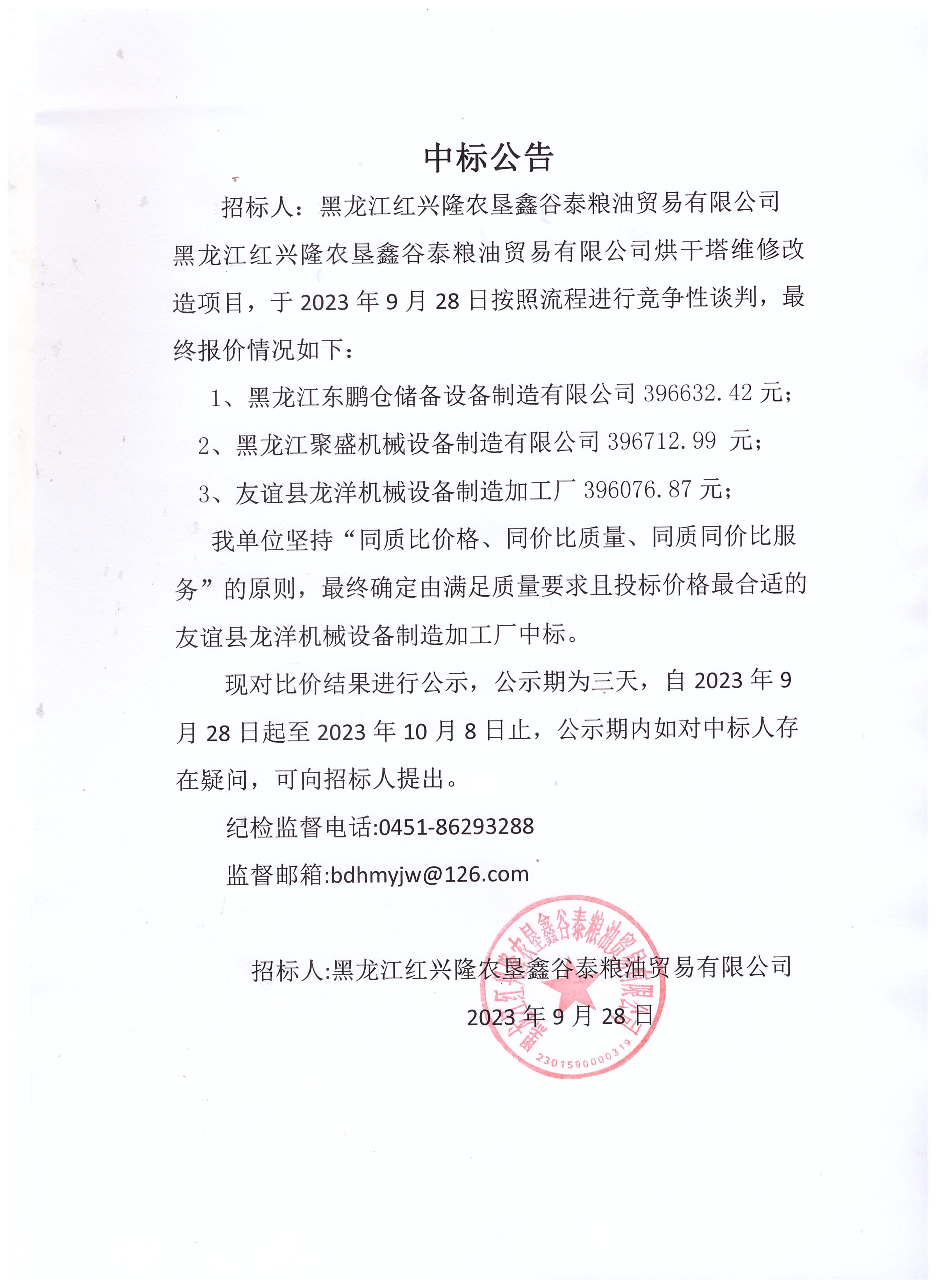 黑龍江紅興隆農(nóng)墾鑫谷泰糧油貿(mào)易有限公司烘干塔維修改造項(xiàng)目中標(biāo)公告