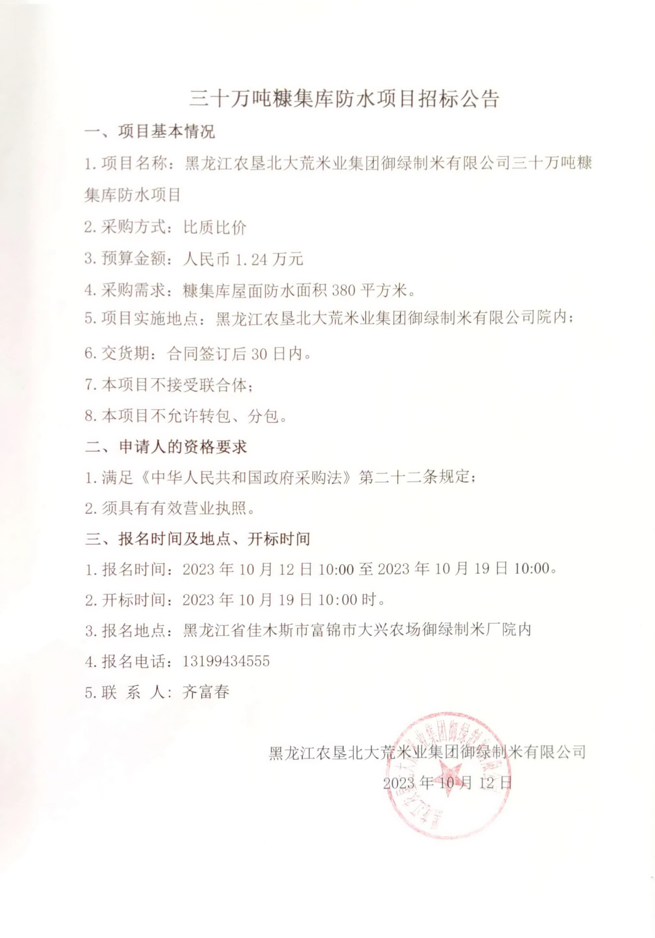 黑龍江農(nóng)墾北大荒米業(yè)集團(tuán)御綠制米有限公司三十萬噸糠集庫防水項(xiàng)目招標(biāo)公告