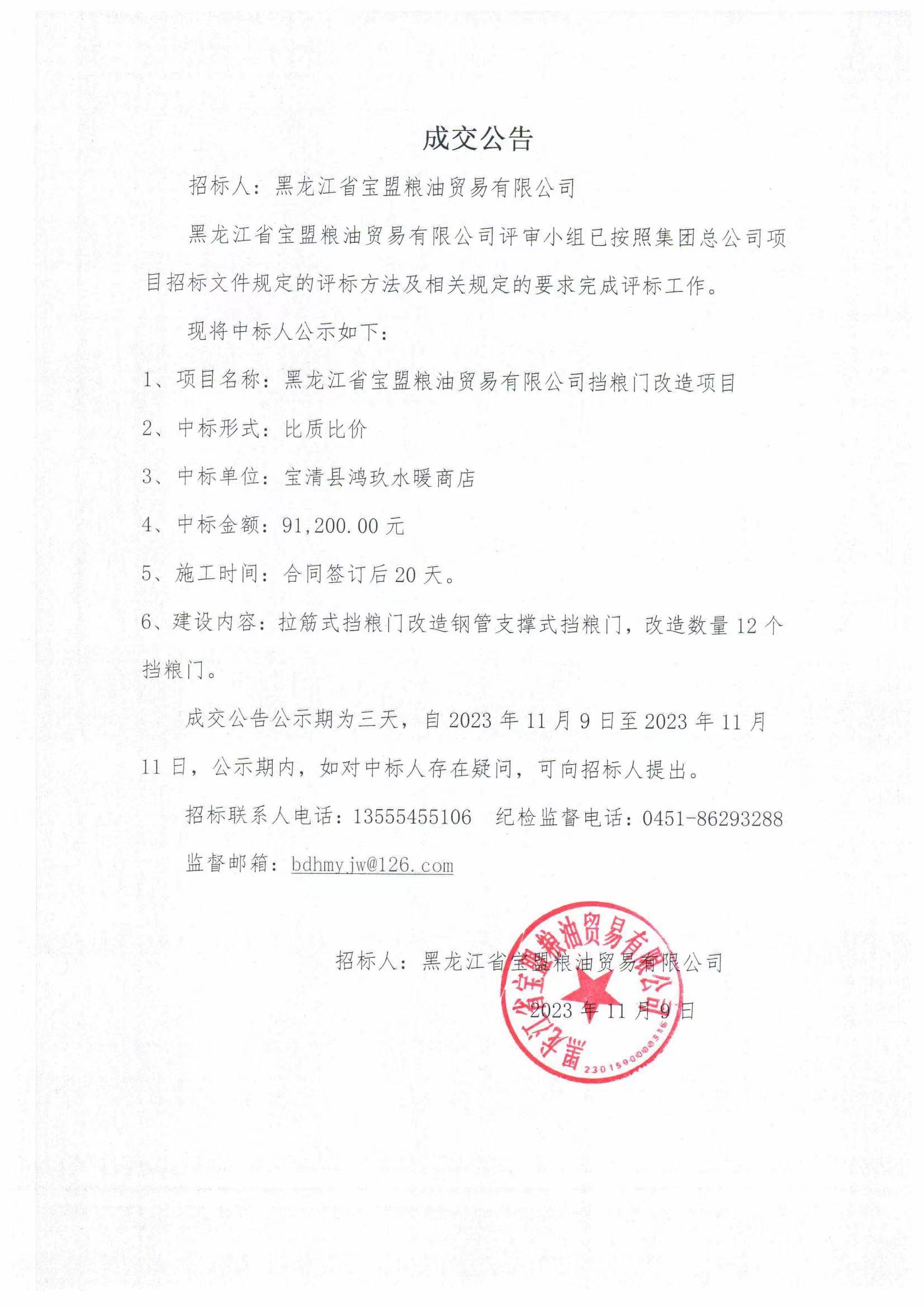 黑龍江省寶盟糧油貿(mào)易有限公司擋糧門改造項(xiàng)目成交公告