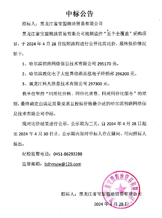 黑龍江省寶盟糧油公司五個(gè)全覆蓋建設(shè)項(xiàng)目中標(biāo)公告