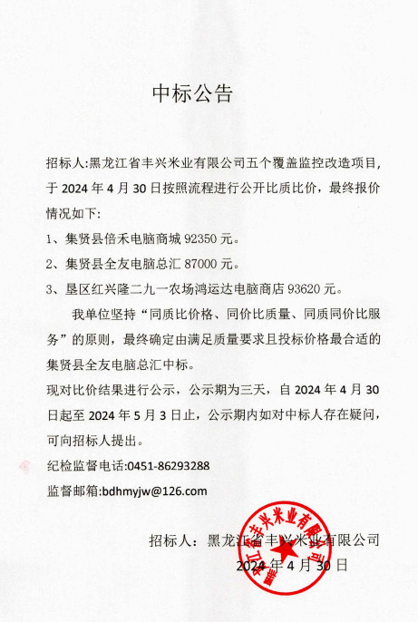 黑龍江省豐興公司五個全覆蓋監(jiān)控改造項目中標(biāo)公告