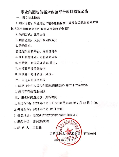 智能碾米實驗平臺項目招標公告
