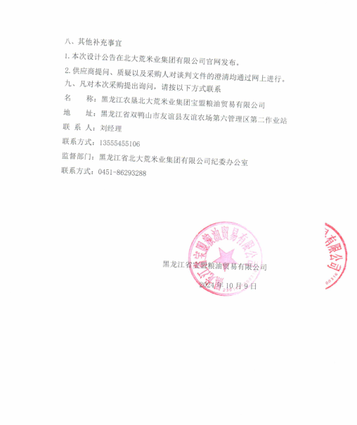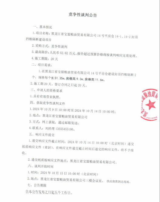 黑龍江省寶盟糧油貿易有限公司14號平房倉擋糧隔斷項目競爭性談判公告