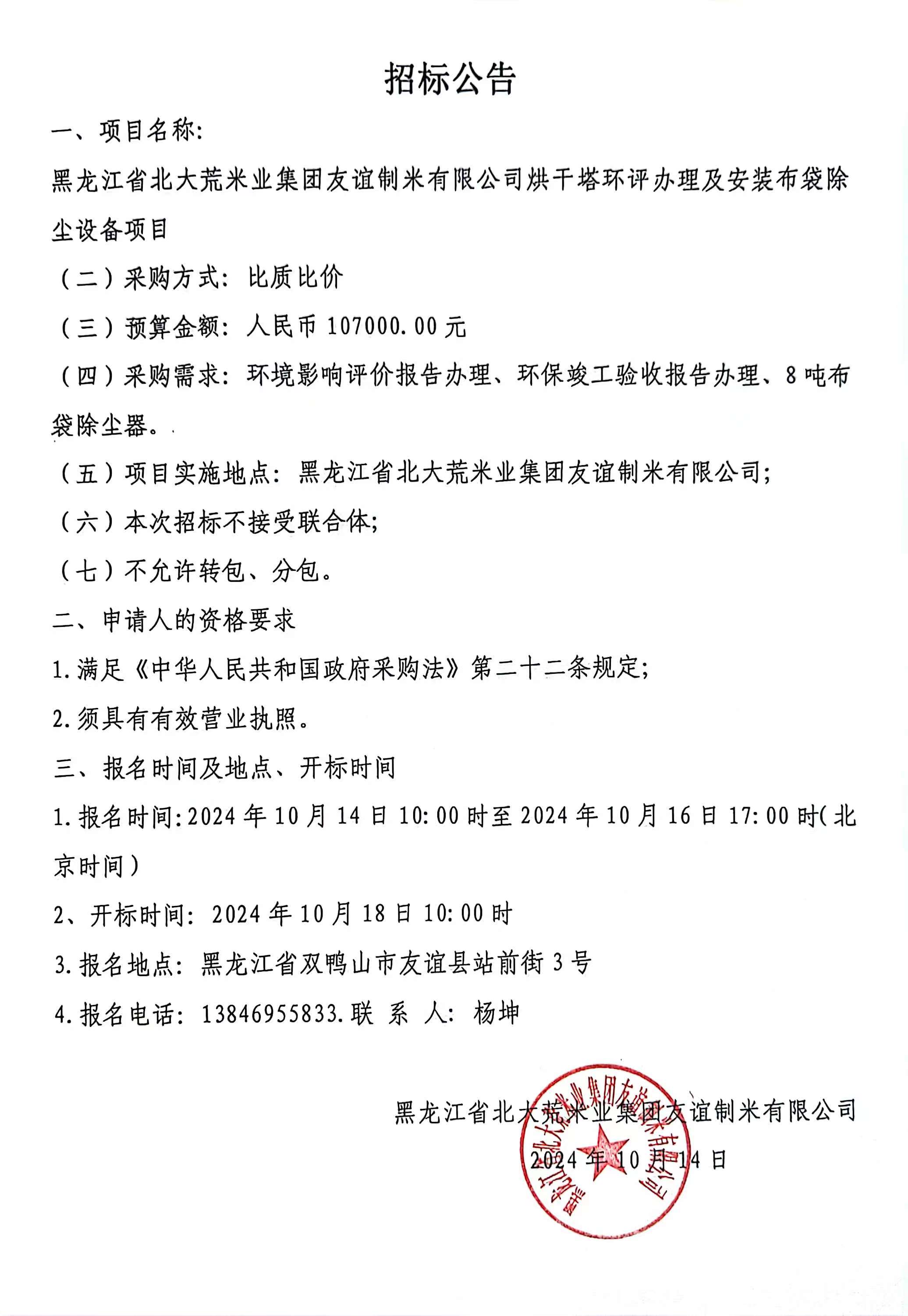 黑龍江省北大荒米業(yè)集團(tuán)友誼制米有限公司烘干塔環(huán)評辦理及安裝布袋除塵設(shè)備項(xiàng)目招標(biāo)公告