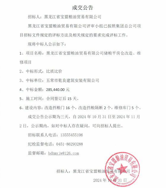 黑龍江省寶盟糧油貿(mào)易有限公司平房倉改造維修項目中標公告