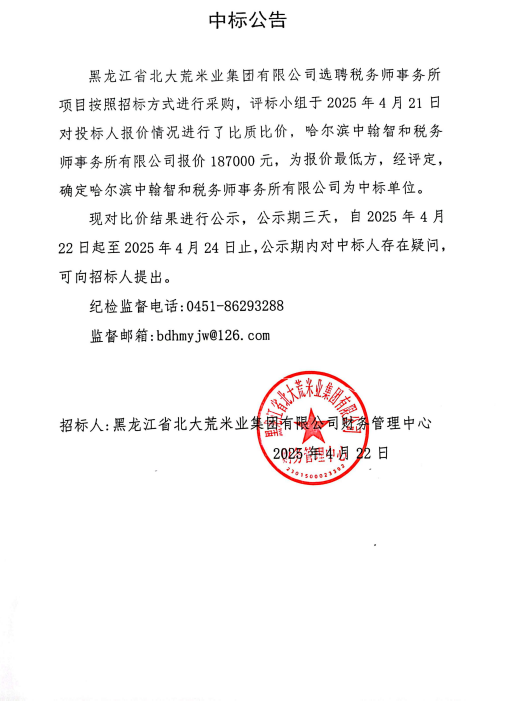 黑龍江省北大荒米業(yè)集團(tuán)有限公司選聘稅務(wù)師事務(wù)所項目中標(biāo)公告