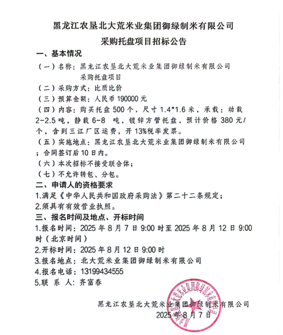 黑龍江省北大荒米業(yè)集團(tuán)御綠制米有限公司采購(gòu)?fù)斜P項(xiàng)目招標(biāo)公告