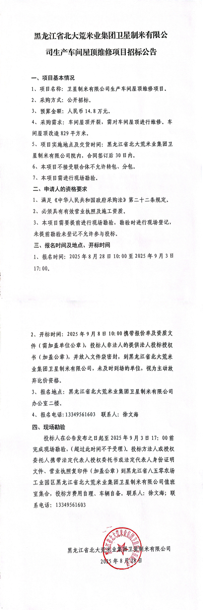 衛(wèi)星制米有限公司生產(chǎn)車(chē)間屋頂維修項(xiàng)目招標(biāo)