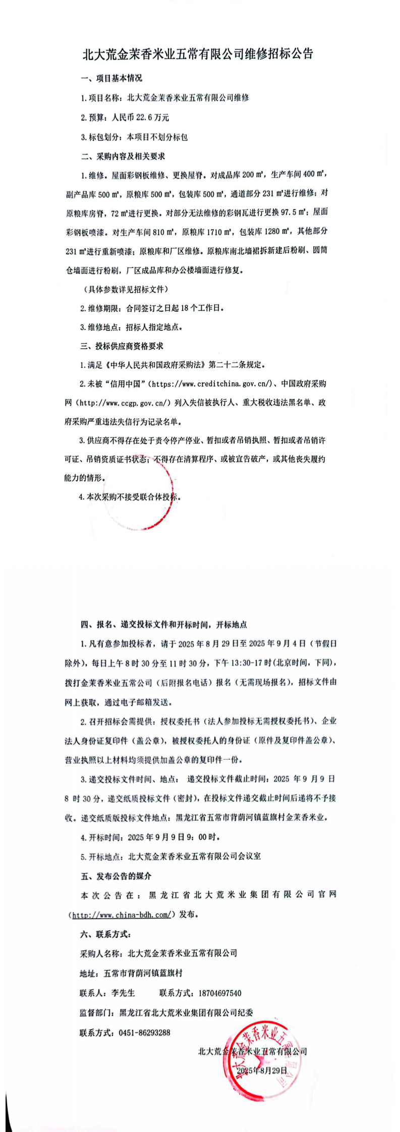 北大荒金茉香米業(yè)五常有限公司維修招標(biāo)公告
