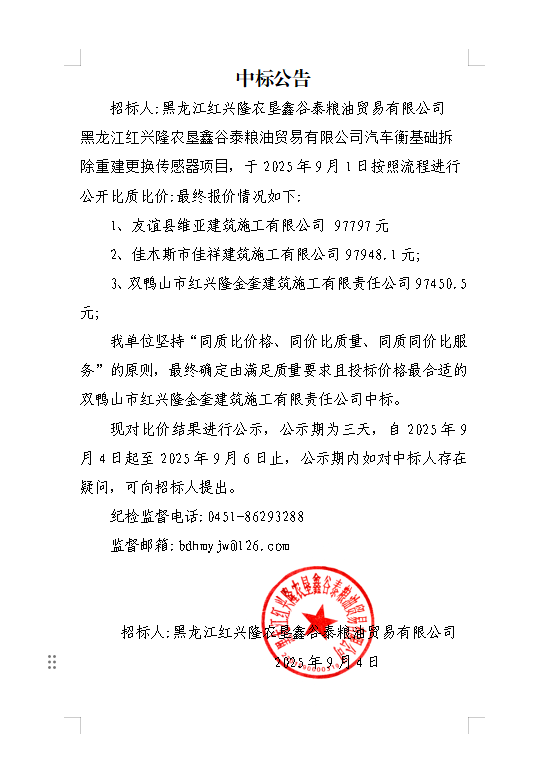 鑫谷泰汽車衡基礎(chǔ)拆除重建更換傳感器項目中標公告