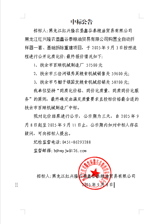 鑫谷泰糧油貿易有限公司購置全自動捍樣器一套、基礎拆除重建項目中標公告