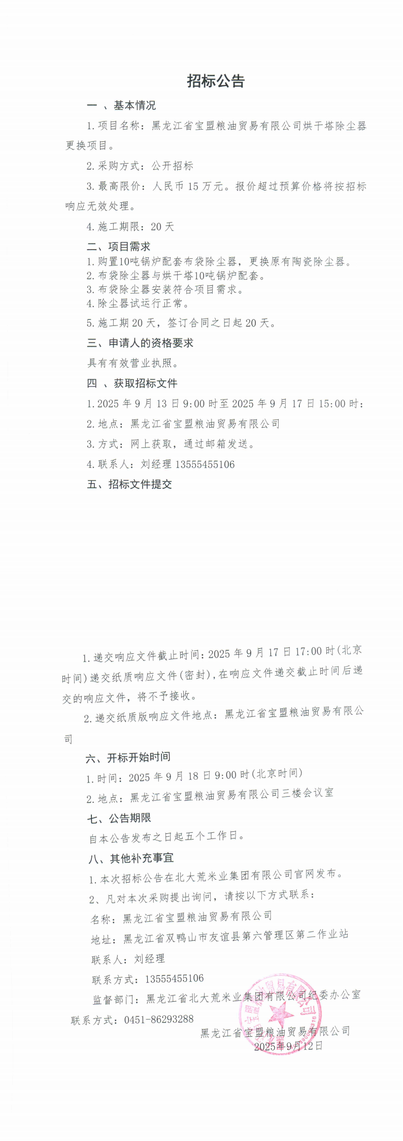 寶盟糧油貿(mào)易有限公司烘干塔除塵器更換項目招標(biāo)公告
