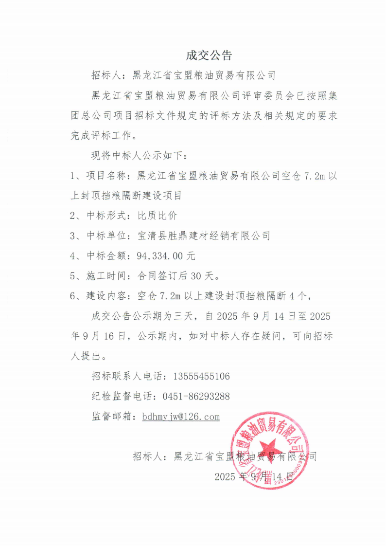 寶盟糧油貿(mào)易有限公司空倉7.2m以上封頂擋糧隔斷建設(shè)項目中標(biāo)公告