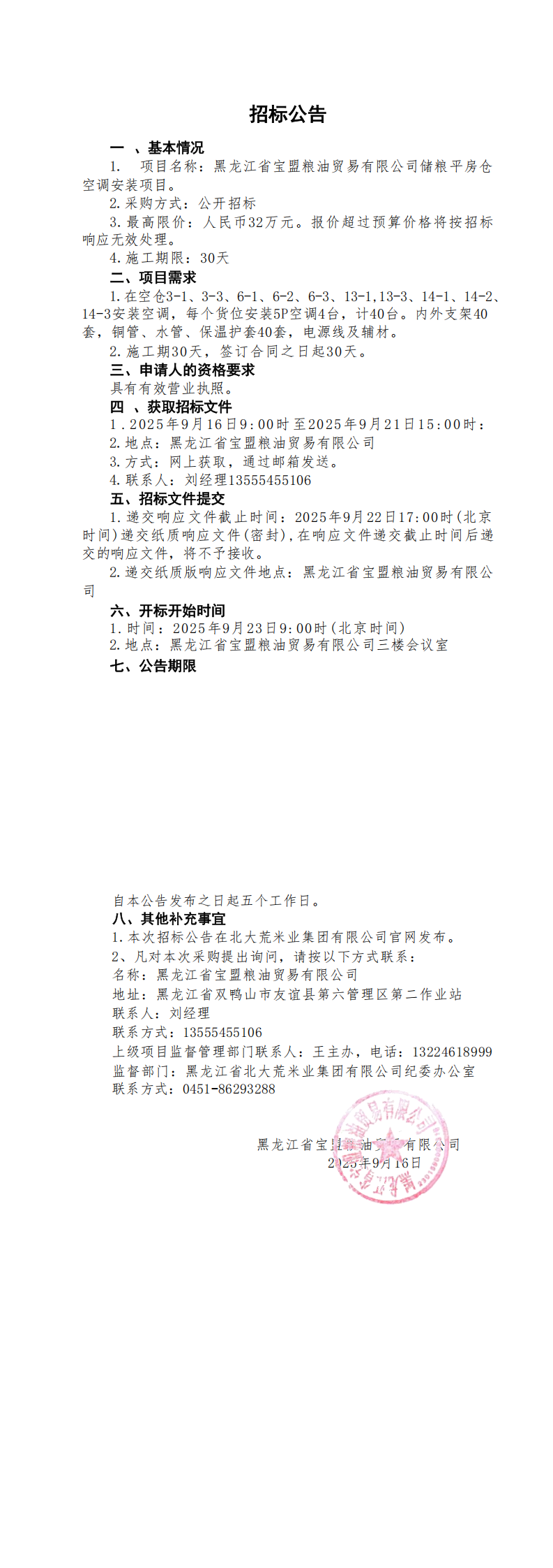 黑龍江省寶盟糧油貿(mào)易有限公司儲(chǔ)糧平房倉 空調(diào)安裝項(xiàng)目招標(biāo)公告