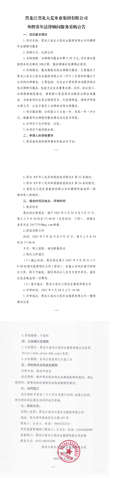 黑龍江省北大荒米業(yè)集團(tuán)有限公司外聘常年法律顧問(wèn)服務(wù)采購(gòu)公告
