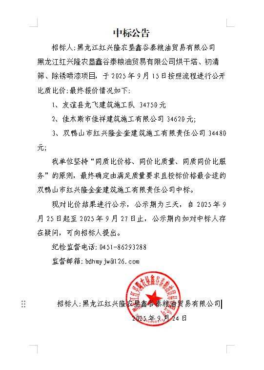 紅興隆農(nóng)墾鑫谷泰糧油貿(mào)易有限公司烘干塔、初清篩、除銹噴漆項(xiàng)目成交公告