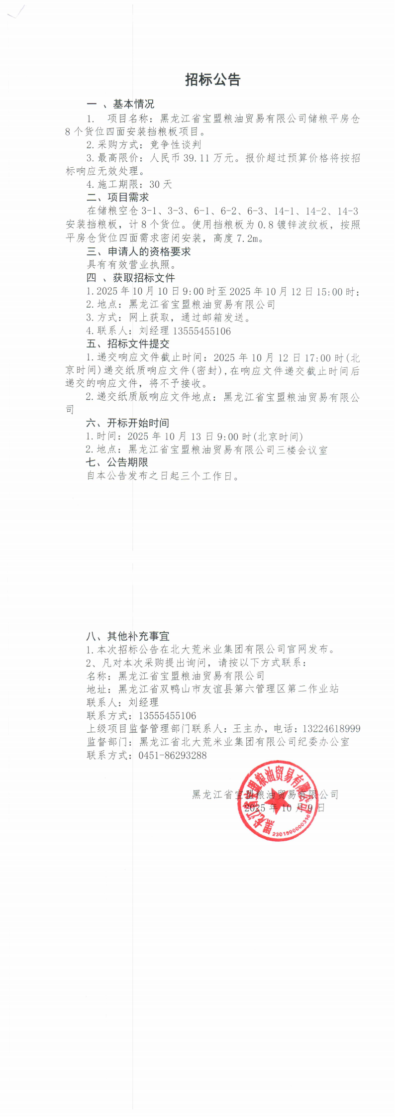黑龍江省寶盟糧油貿(mào)易有限公司儲(chǔ)糧平房倉(cāng) 8個(gè)貨位四面安裝擋糧板項(xiàng)目采購(gòu)公告
