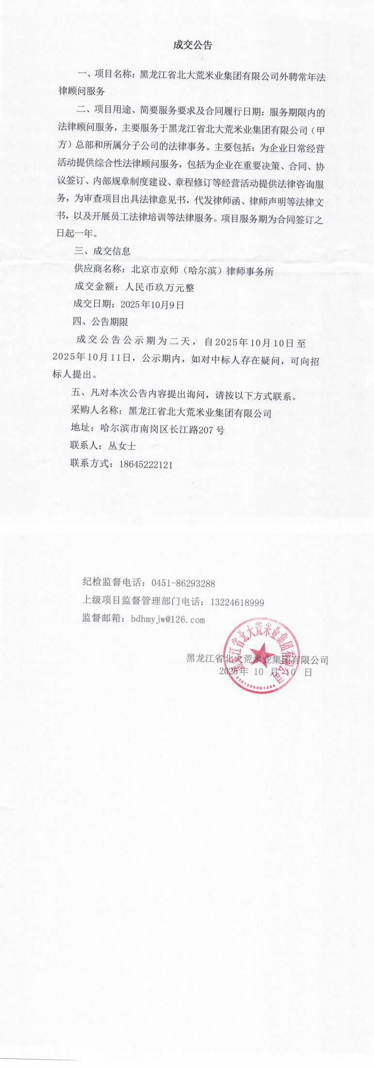 黑龍江省北大荒米業(yè)集團(tuán)有限公司外聘常年法律顧問服務(wù)成交公告