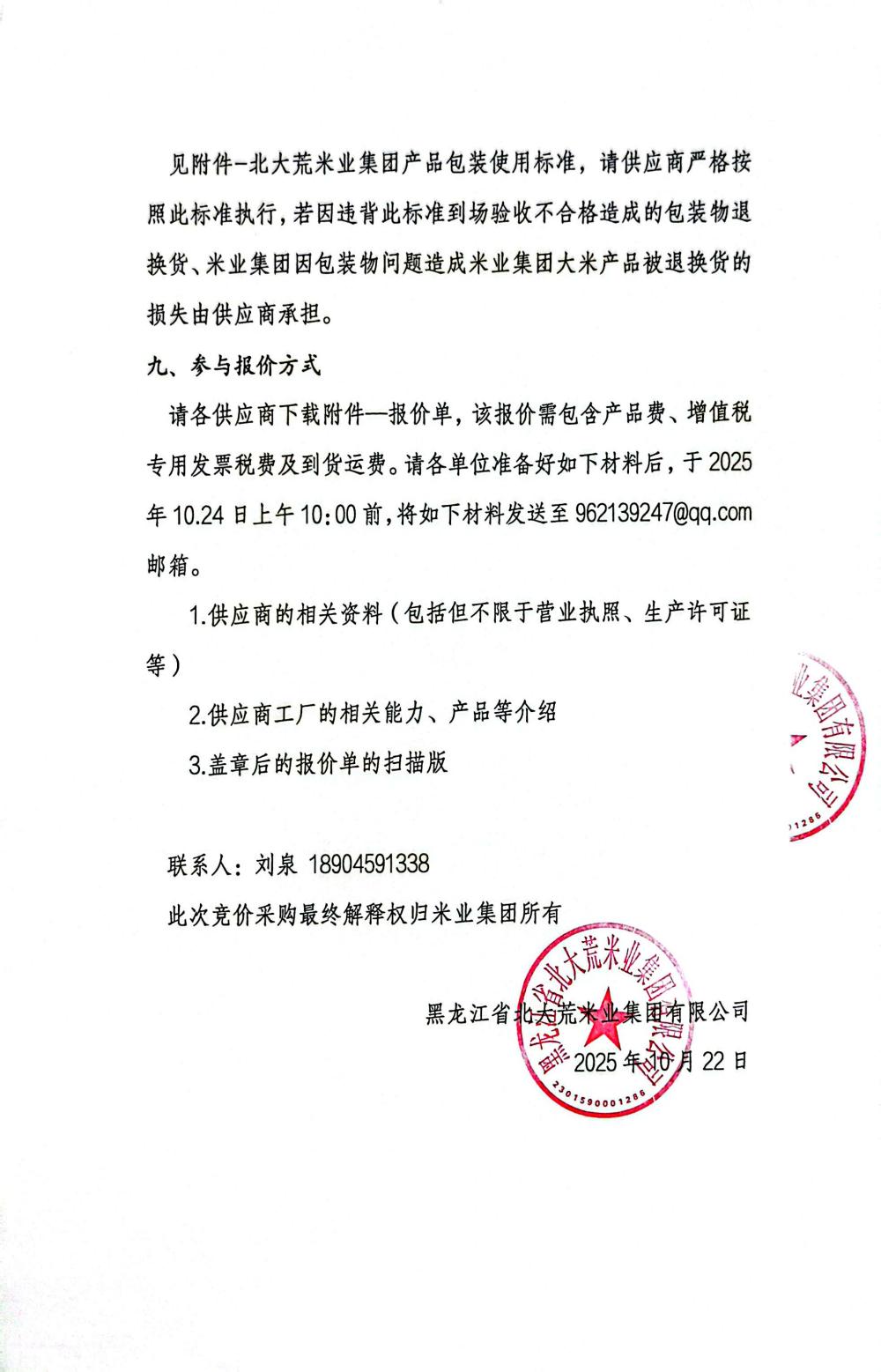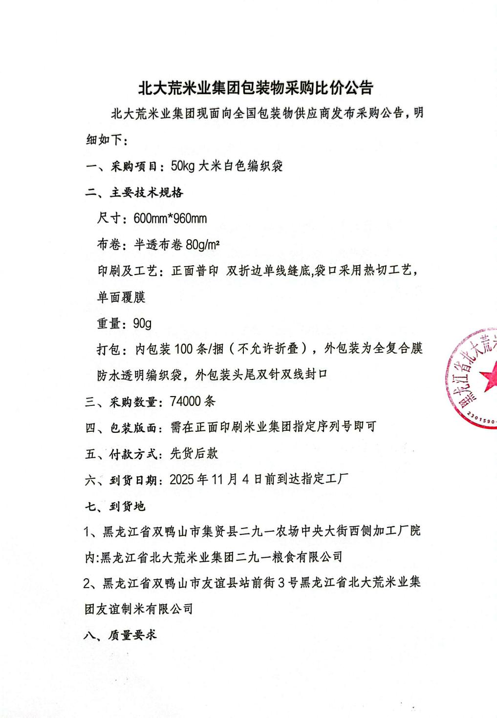 北大荒米業(yè)集團(tuán)包裝物采購(gòu)公告